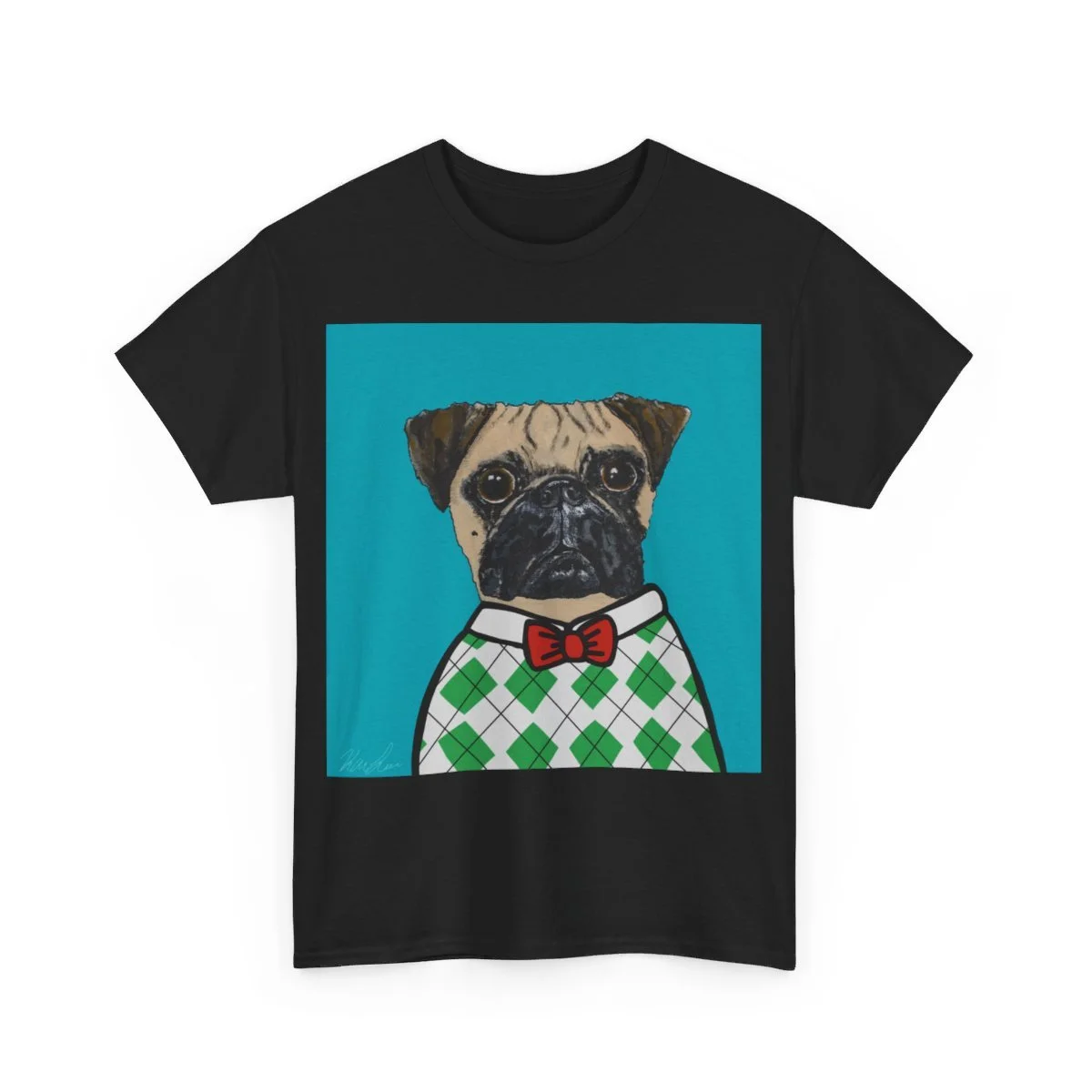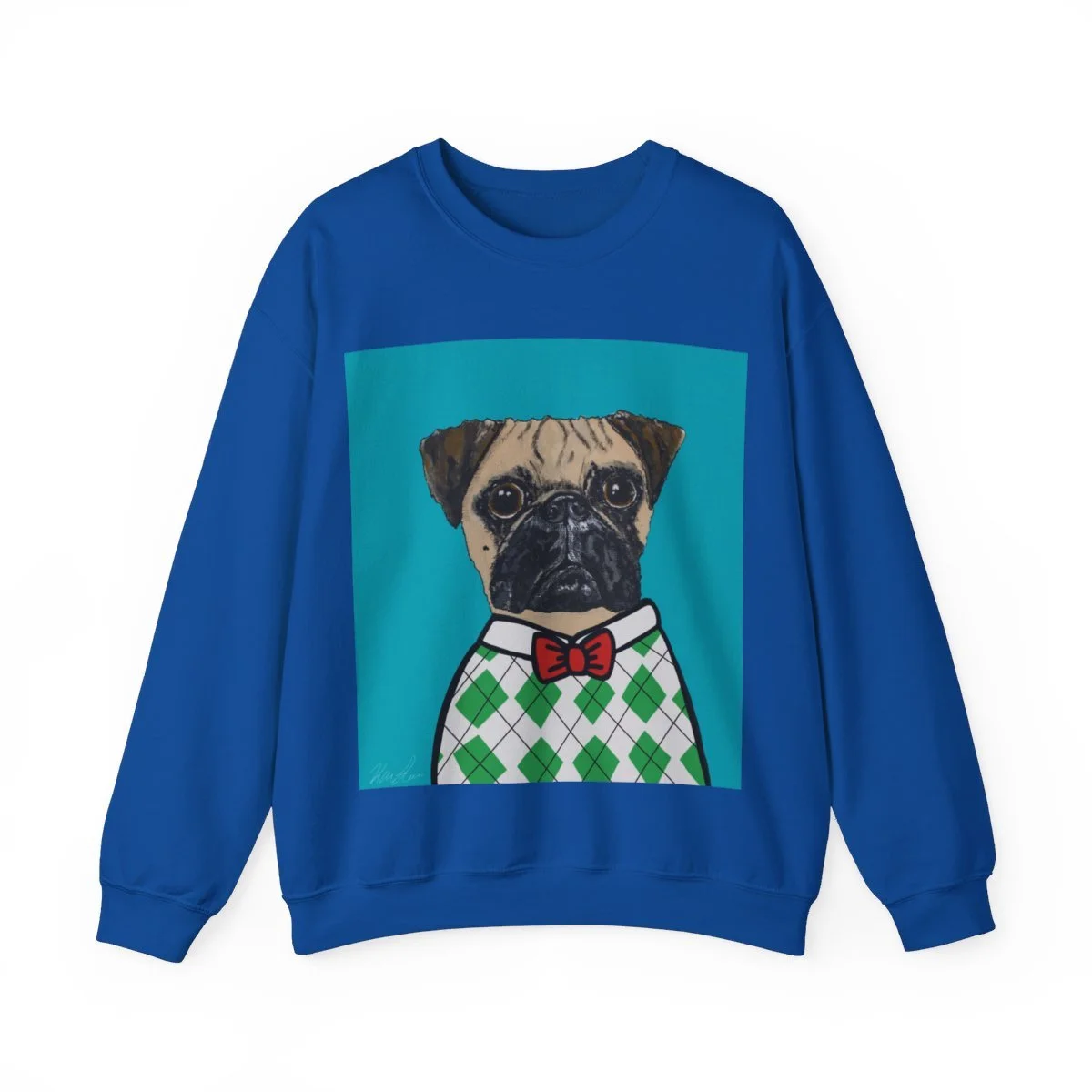 This painting was Andy’s first portrait as part of the grumble, and when I painted it, it felt as if I were getting him ready for his first day of school or picture day. I don’t know about you, but when I think back to school pictures, I remember countless argyle sweaters and for the unfortunate few, a bow tie. Even though Andy never left the house in this getup, I just know that if this had been his school photo, he would be coming back home with a missing bow tie, a chewed up argyle sweater, and somehow be completely covered in mud.