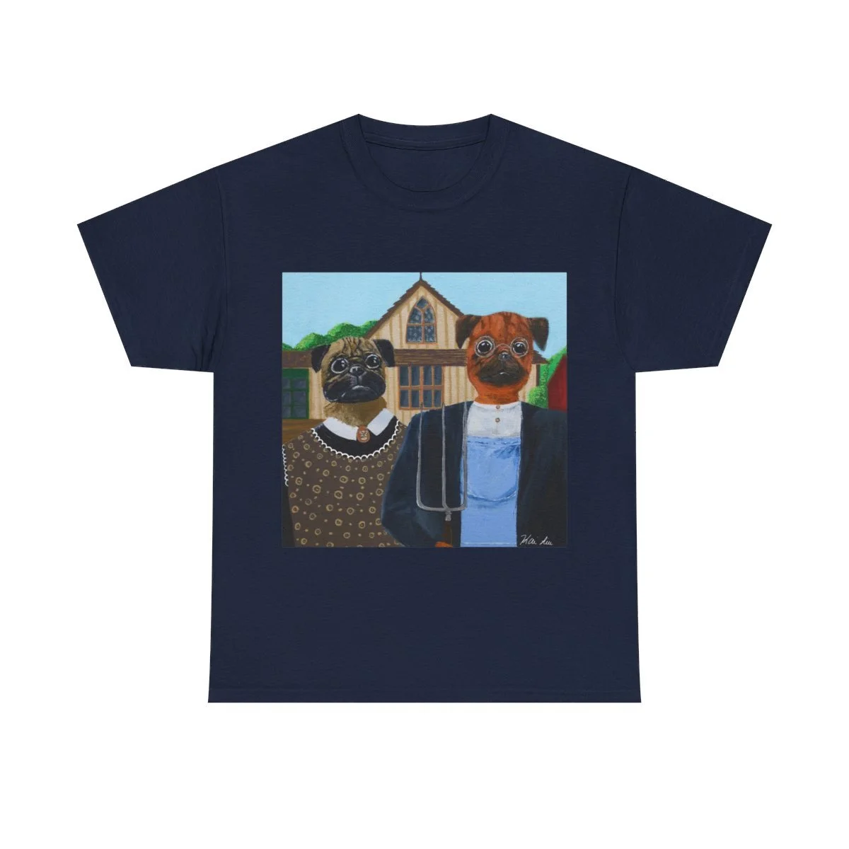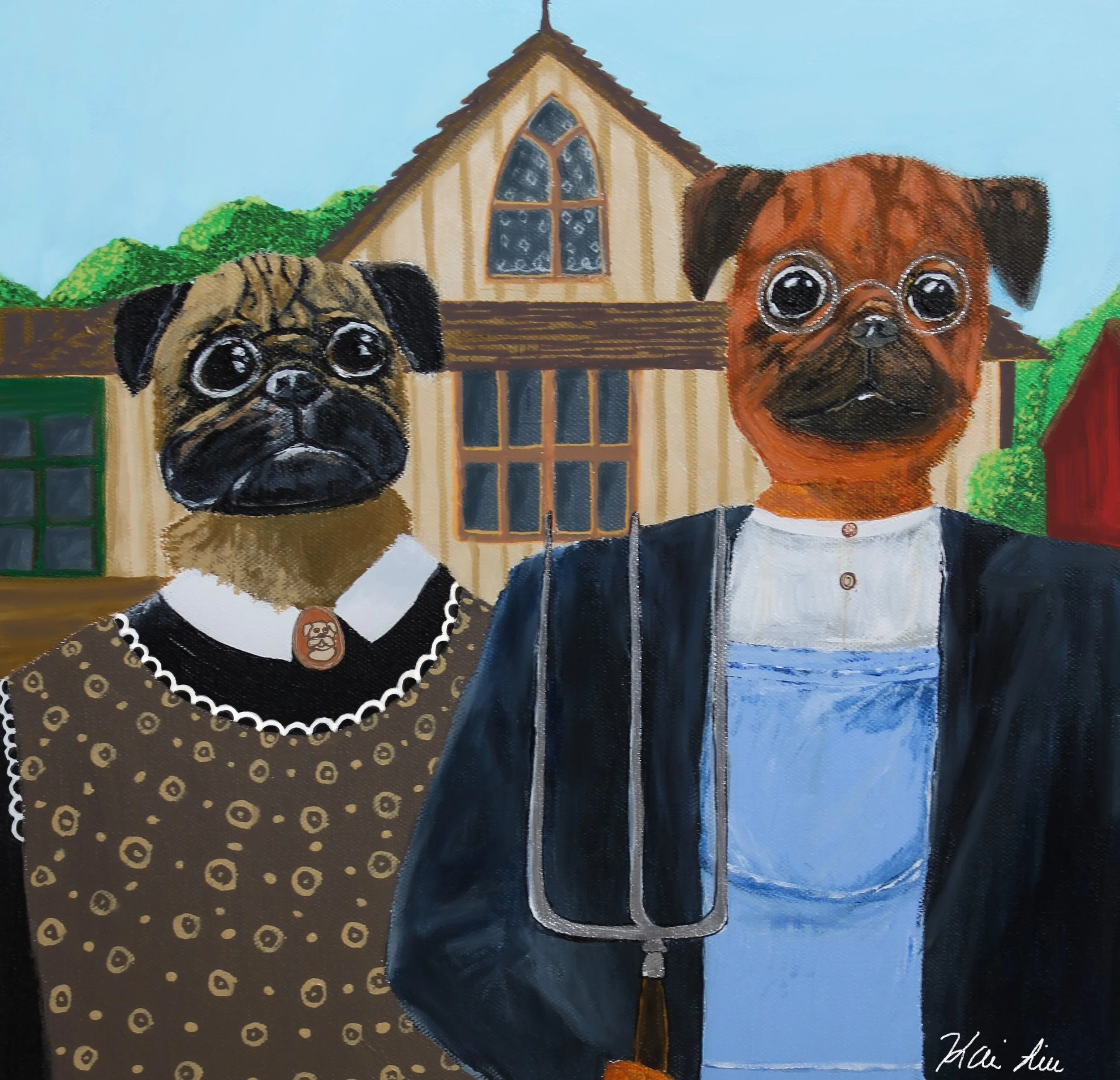 There has always been something so funny to me about Grant Wood’s American Gothic. The stern yet aloof expression of the man’s face partnered with the woman’s disappointed glare begged for my own version of the classic painting, thus Pug Gothic was born. There are many interpretations of what Wood was trying to portray with his work on Americana, and if the pair were husband and wife, brother and sister, or even just individuals of no relation on a working farm. The one connecting thread that is addressed in many theories is the surprised disappointment on the woman’s face. While I could provide you with a few theories of my own about the relationship, I am no art history buff, and using Dobby and Norbert as models was a no brainer. Dobby, my half pug half Pomchi (Pomeranian and Chihuahua) mix is one of the most agile, fun loving, yet fickle personalities I’ve ever met. He could be gently snuggling up to you one minute, then joyfully growling at you for attention in the next. His hot and cold temperament puzzles just about everyone he comes across, including is brother Norbert. In my day to day life, I see Norbert giving Dobby the look of perplexed disappointment more than once. I hope you enjoy this piece appropriately titled “Pug Gothic” as much as I enjoyed creating it. Recreating a painting already known to most of the world is never easy, but I’m really proud of this piece. I hope it makes you chuckle.